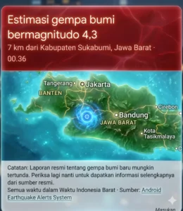 Sukabumi – Keheningan malam di wilayah Jawa Barat seketika pecah saat guncangan gempa bumi berkekuatan Magnitudo 4,3 melanda Kabupaten Sukabumi dan sekitarnya, hari Minggu, tanggal (15/03/2026).