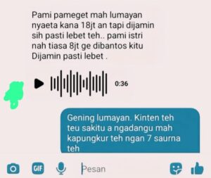 “Pami pameget mah lumayan nyaeta kana 18jt an tapi dijamin pasti lebet,” demikian kutipan dalam percakapan tersebut, yang jika diterjemahkan berarti bahwa untuk pelamar laki-laki biaya yang diminta sekitar Rp18 juta dengan jaminan diterima bekerja.