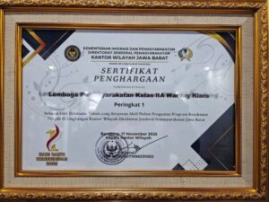 BANDUNG — Kepala Lembaga Pemasyarakatan Kelas IIA Warungkiara Kurnia Panji Pamekas menerima penghargaan Predikat 1 dari Kepala Kantor Wilayah Direktorat Jenderal Pemasyarakatan Jawa Barat atas peran aktif dalam penguatan ketahanan pangan di lembaga pemasyarakatan.
